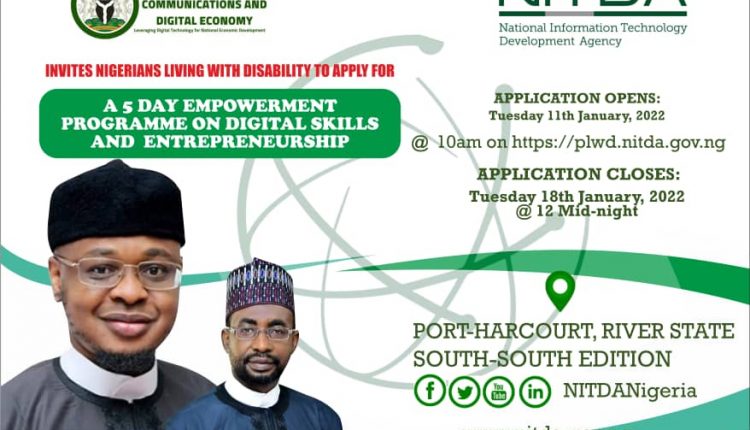 In line with the actualization of the National Digital Economy Policy and Strategy NDEPS mandate of attaining 95% digital literacy by 2030, the National Information Technology Development Agency (NITDA) has issued a notification to the public on the opening of portal and inviting Nigerians from the South-South region of Persons with Disability (PWDs) to apply for a 5-day training program on digital skills and entrepreneurship.