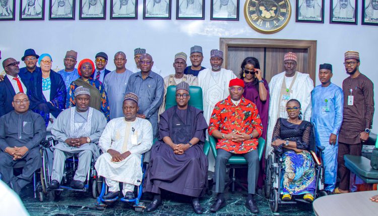 Speaker of the House of Representatives Rt. Hon. Abbas Tajudeen, Ph.D (3rd right); Deputy Speaker Rt. Hon. Benjamin Okezie Kalu (2nd right); Executive Secretary, National Commission for Persons With Disabilities, Hon. Ayuba Burki Gufwan (3rd left), and other members of the commission’s management team during a courtesy visit on the Speaker on Wednesday. Photo: Speaker’s Office