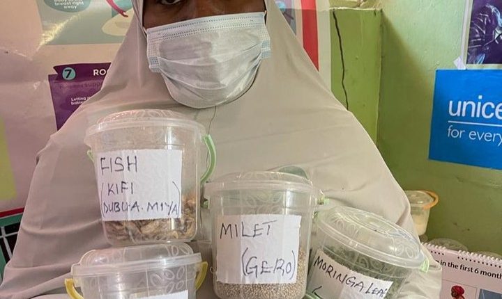 Aisha Umar counsels pregnant women and new mothers at the UNICEF-supported Maisandari Primary Healthcare Centre in Damaturu, north-east #Nigeria. She keeps small quantities of rice, fish, moringa leaves, beans and other foods in her corner at the centre.